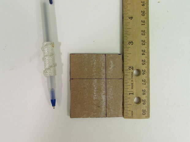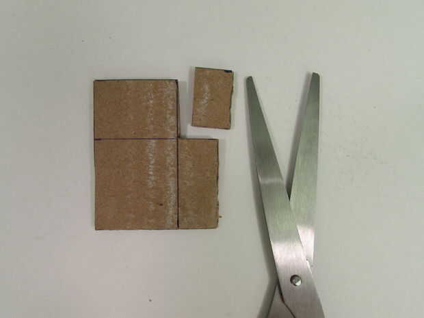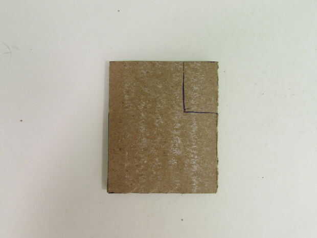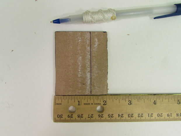 Hacer una línea longitudinal a lo largo de la pieza de cartón, 1 3/8 pulgadas de un lado. Hacer otra, perpendicular línea 1 pulgada de la parte inferior. (Hice mi 1 1/2 pulgada de la parte inferior, pero esto resultó para ser un error, como veremos más adelante). Corte la pequeña pieza rectangular formada por las dos líneas.