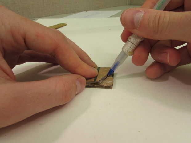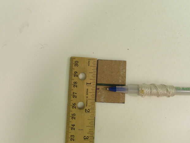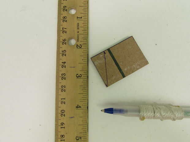 Una de las piezas que sólo recortar y una marca de 1 1/8 pulgadas de un extremo (como en la primera foto). Utilice la regla para dibujar una línea desde ese extremo a la esquina cercana (como en la segunda foto).
