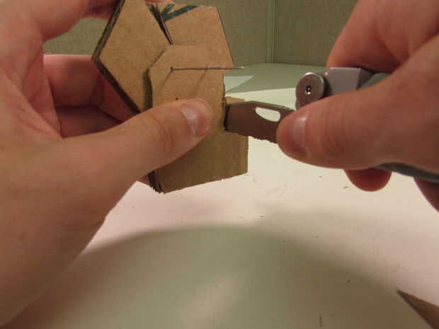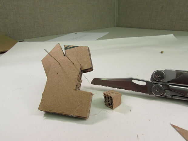 Tan todos a lo largo de este Instructable, te he estado diciendo sobre el error que cometen al dimensionar a mi espaciador para mi garra. Después de pegar todos mis pedazos, finalmente me di cuenta que mi uña no se pudo abrir completamente debido a la interferencia. Esta fijación necesaria que cortar una esquina de mi pieza de la palma y recortar las esquinas de mis garras.