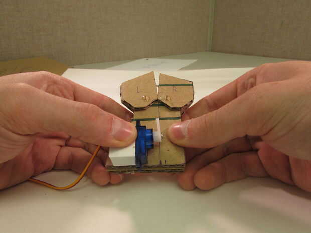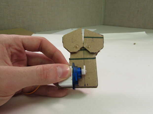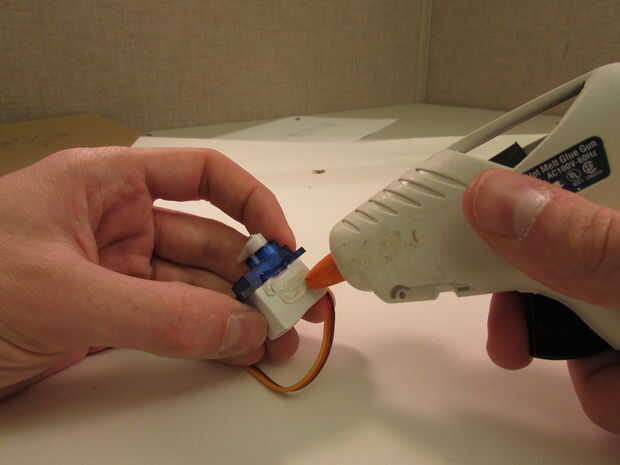 Probar posiciones para su servo presionando contra la palma. Trate de encontrar uno que tiene su brazo alineado entre sus dos garras. Añadir un poco de pegamento y pegar en su lugar.