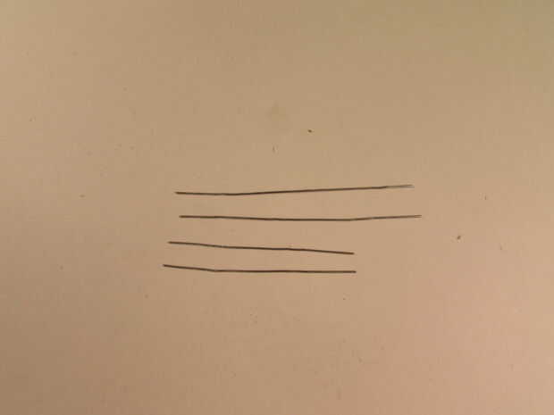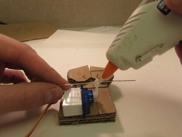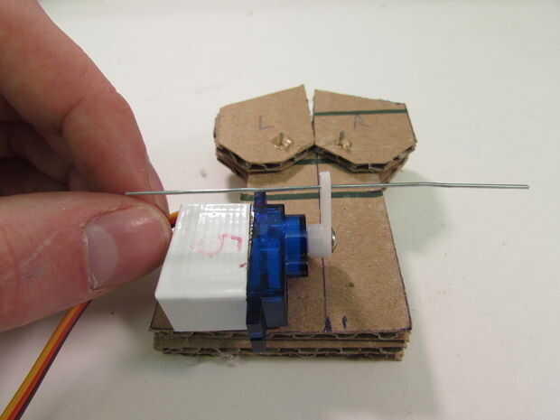 Tras el último paso, tienes cuatro pedazos de alambre, dos más cortas y dos más. Tomar una de las piezas más cortas y colócala en el orificio superior de la servo. Conseguirlo como a medio camino a través, y pegar el alambre en su lugar.