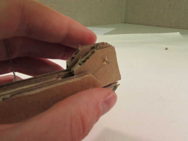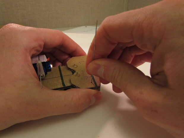 Tomar uno de tus chinchetas y páselo a través de su garra, un poco debajo de la esquina exterior. Presione duro para asegurarse de que va la mayor parte del camino a través (se debe ver una chuleta pequeña en el lado opuesto como en el cuadro 3).