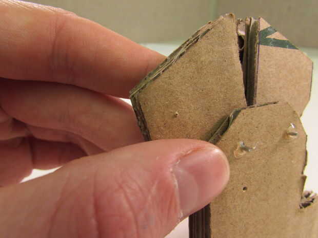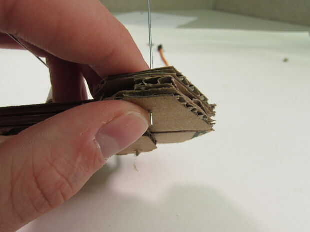 Tire el pulgar se saca y empuje el cable a través de. Será un poco difícil porque usted está empujando también a través de dos capas de pegamento. Seguir empujando hasta llegar un poco de alambre que se pega hacia fuera el lado opuesto. Pegue esto en su lugar.