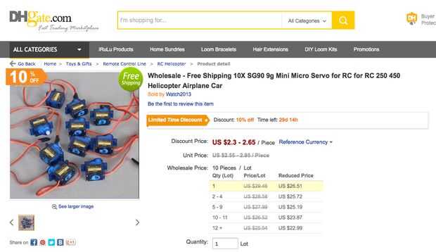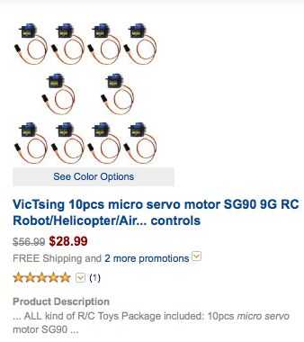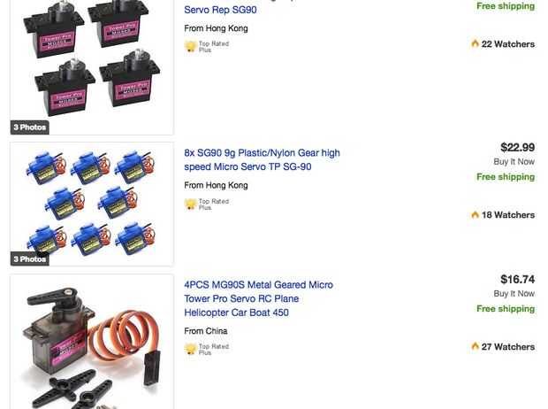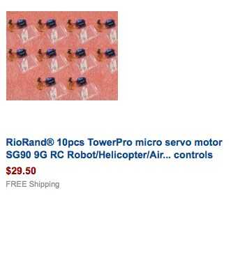 Servos vienen en todo tipo de tamaños. Usted puede generalmente encontrar un pack de diez microservos baratos (el segundo en tamaño más pequeño) para en algún lugar entre $20 y $30. Hacer una búsqueda de "bulto micro servos" o "diez micro servos" en Amazon, Ebay y las páginas de compras de Google y luego restringir el rango de precios a $20 ~ $30 me dio un par de buenos resultados, con un poco de cavar. Como regla general, usted realmente no debería pagar más de $2 ~ $3 para cada servo, porque eso es lo que cuestan para comprar por mayor, así que si encuentras servos a un precio individual de $2,80, ve por ella!