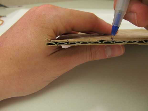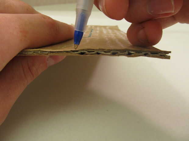 Gire su cartón para que el borde con el corrugado quede frente a usted otra vez. Haga una marca dos, cuatro y seis golpes en el borde. Hacer lo mismo en el otro lado y conecte los tres pares de marcas.