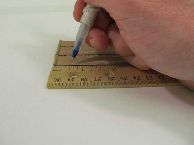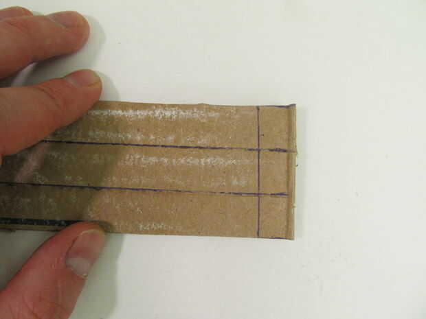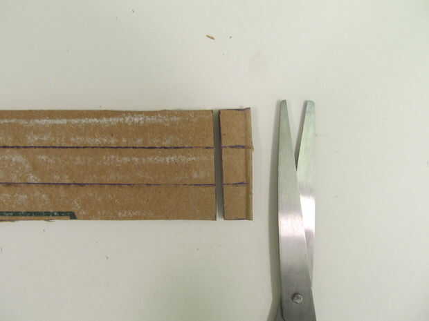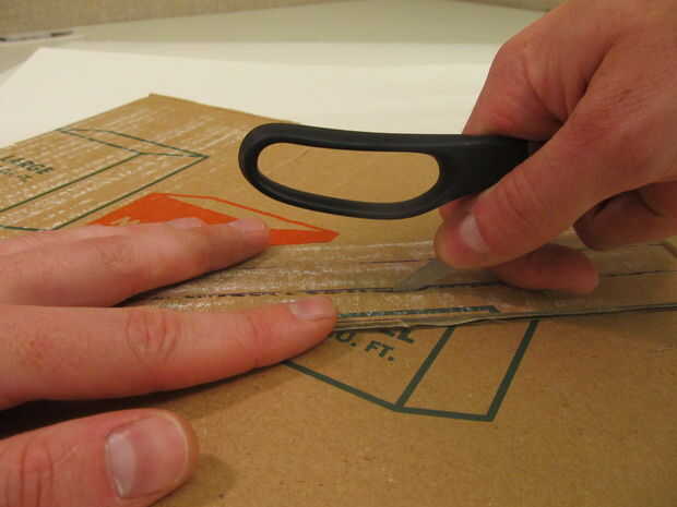 Use sus tijeras para fregar a lo largo de las dos líneas restantes. Esto puede ser un poco peligroso, por lo niños pueden un adulto para hacerlo para ellos. No necesita presionar muy duro, porque sólo quiere cortar a través de la capa superior de la cartulina, dejando intacta la capa de la corrugación y la capa inferior.