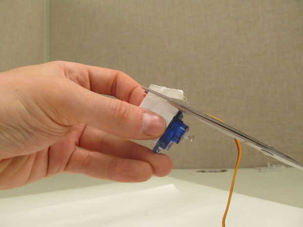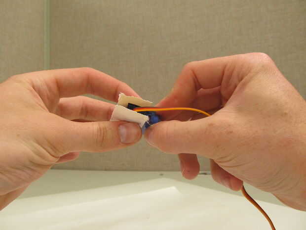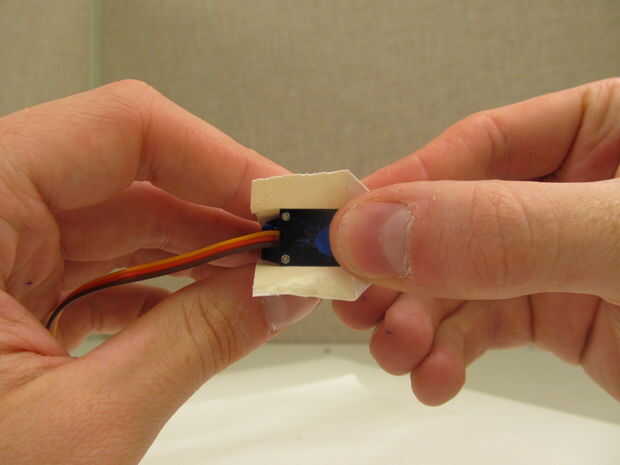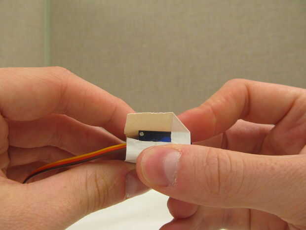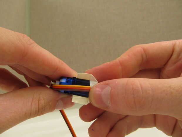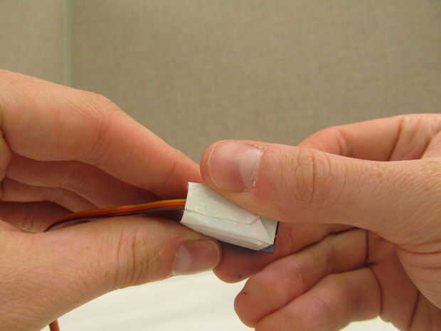 Girar el servo para que el lado con los cables quede frente a usted. Doble el borde inferior de la cinta del conducto como hiciste antes, para hacer dos dobleces de ángulo de 45 grados (ver figura 10). Ahora doblar ambas aletas, y listo!