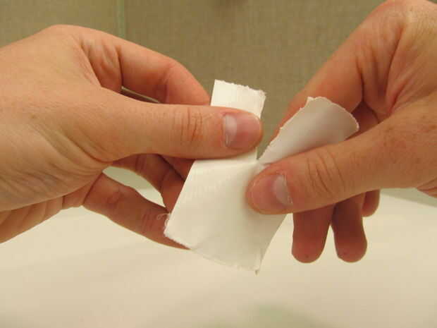 Comience por cortar al hilo un pedazo de cinta del conducto, unos tres o cuatro pulgadas de largo. Luego lágrima o que pieza por la mitad, longitudinalmente. (Si guarda la otra mitad, tendrás una segunda pieza para envolver otro servo).