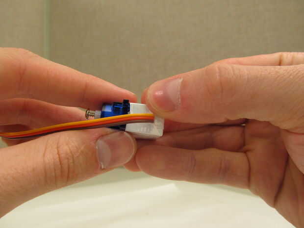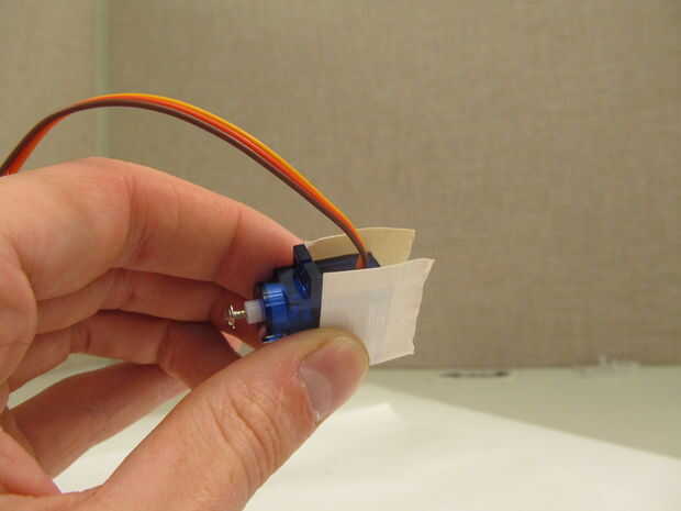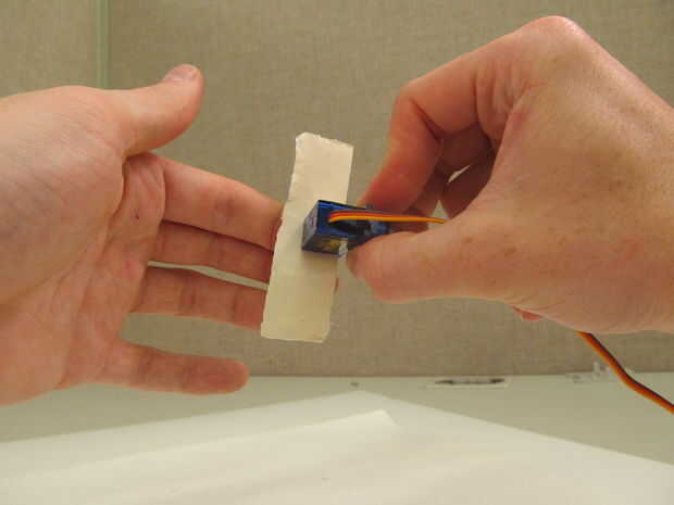 Enchufe el extremo pequeño de tu servo (el que está enfrente de la cara con los cables) aproximadamente a la mitad a lo largo de su pedazo de cinta adhesiva. Me gusta para asegurarse de que el borde suave, no arrancó de mi cinta colillas contra los soportes de montaje de servos.