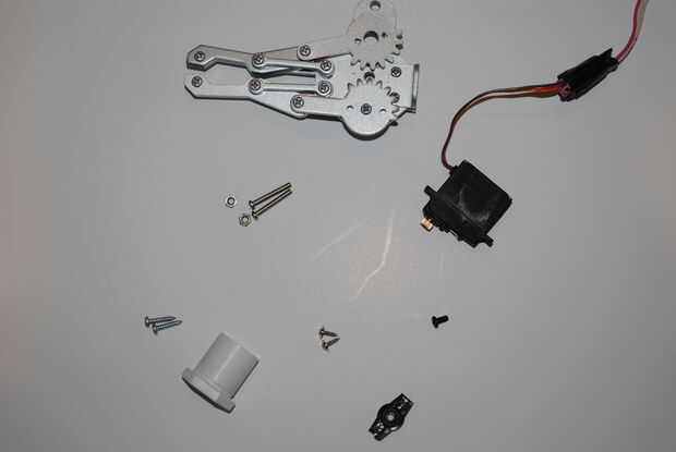 Con la pinza cerrada, coloque la garra en el cuerno del servo con los dos tornillos pequeños de plata incluidos con el motor.