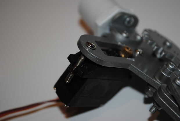 Para acoplar el motor a la garra, ponga el motor a través de la ranura de la pinza y usar los incluidos tornillos y tuercas para mantener el motor en su lugar, pero tenga cuidado de no apretar en exceso.