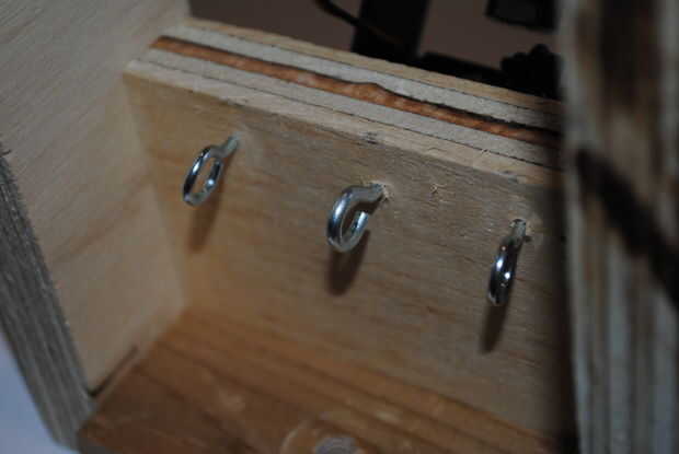 En primer lugar, atornille los ganchos de cinco ojo en cada agujero que se hizo para un gancho de ojo (tres en el brazo de montaje) y dos en el primer tramo de tubería de PVC.