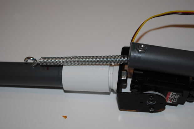 El resorte final conecta a través de la articulación del codo. Para hacer esto, quite la tuerca del perno de primera en el tubo de PVC, un extremo del resbalón de la primavera en el perno interior de la tubería, luego vuelva a colocar la tuerca en el perno.