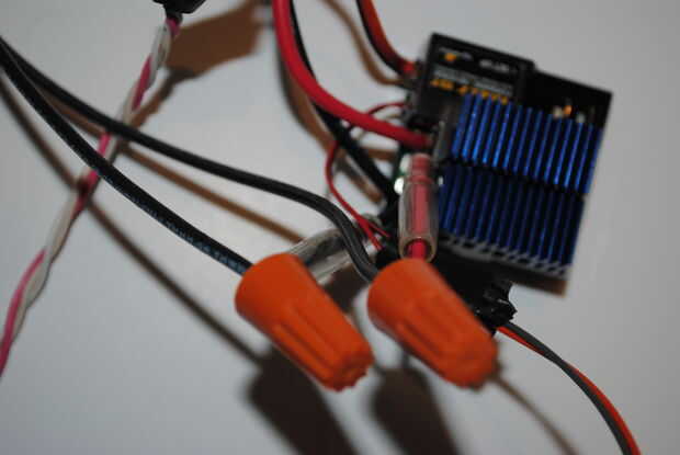 Utilizando tuercas para alambre, sujete los cables conectados a los conductores del motor del taladro a la ESC.