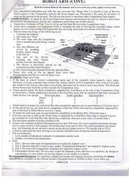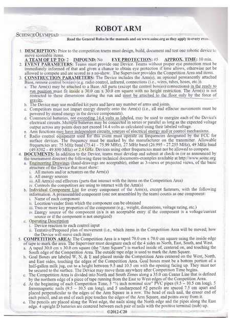 Para el brazo Robot, específicamente, el robot cuenta con parámetros de construcción específicos, documentación requerida, un área de competencia específica y detalles de la competencia y un único sistema de puntuación, como el contorno de las hojas de la dos regla.