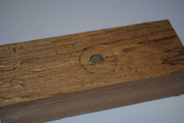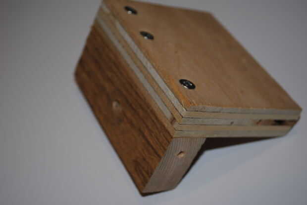 Perfore tres agujeros a través del 3 "x 3 3/4" pieza y la madera de 7/8" base lado y asegúrelo con tornillos.