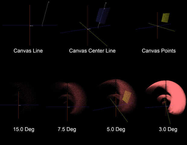 En realidad, el lienzo es un límite fijo en un plano. Necesitamos definir puntos fijos dentro de ese límite, por lo que podemos llegar a un total finito de puntos para pintar. Puesto que la imagen que reciba de la cámara es de 80 por 60 píxeles, vamos restricción nuestra área objetivo a 60 por 60 puntos espaciados 3 milímetros para un total de 3600 posibles dianas para la punta del pincel. Aunque hay muchos puntos, sólo tenemos que calcular 60 coordenadas para cada eje. ¿Por qué? Las "filas" en nuestro lienzo zona compartir el mismo X y Y valores, pero tienen diferentes valores de Z. Las "columnas" en nuestra área de lona todas tienen el mismo valor de Z, pero los diferentes valores XY. Con todo esto en mente, podemos determinar todos los puntos de posible objetivo con sólo 60 valores por coordenadas. Los detalles exactos de este son más claramente explican mi bosquejo de procesamiento.