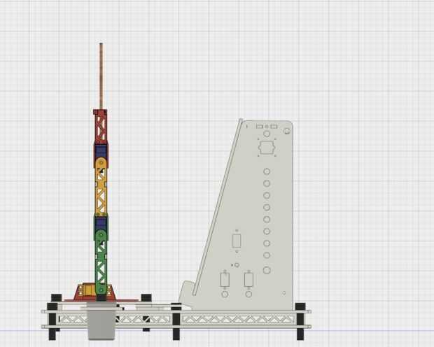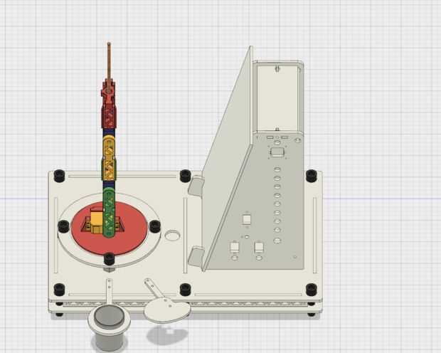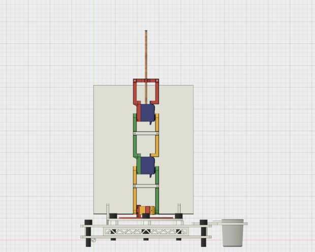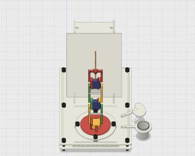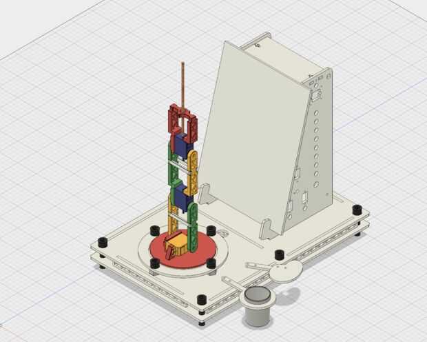 Decidía sobre un diseño de 4 grados de libertad ya que este es el arreglo mínimo necesario para pintar el lienzo vertical mientras sigue permitiendo el brazo a mojar el pincel en la pintura y la taza, de agua que están en el mismo plano que la base del robot. Con esto en mente, hice un modelo bastante detallado de la máquina utilizando Autodesk 360 de fusión (que es un gran programa, gratis para uso de aficionados mientras que todavía teniendo una tonelada de características!).