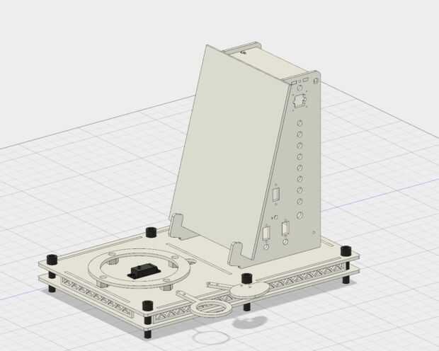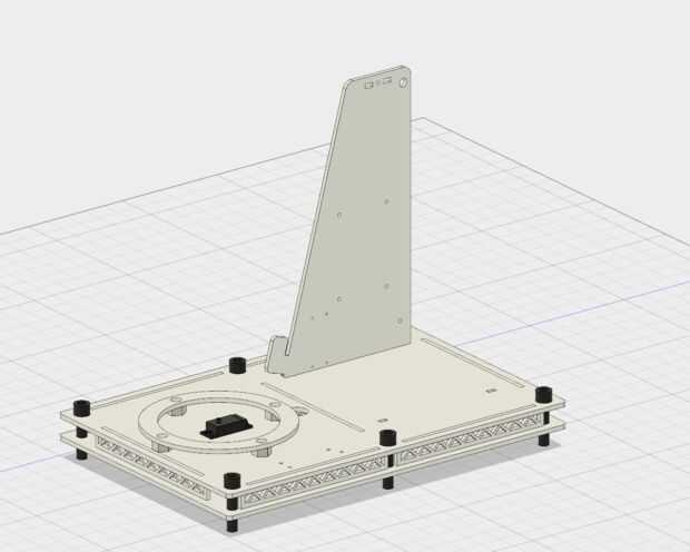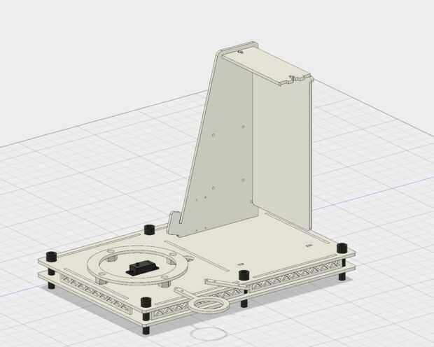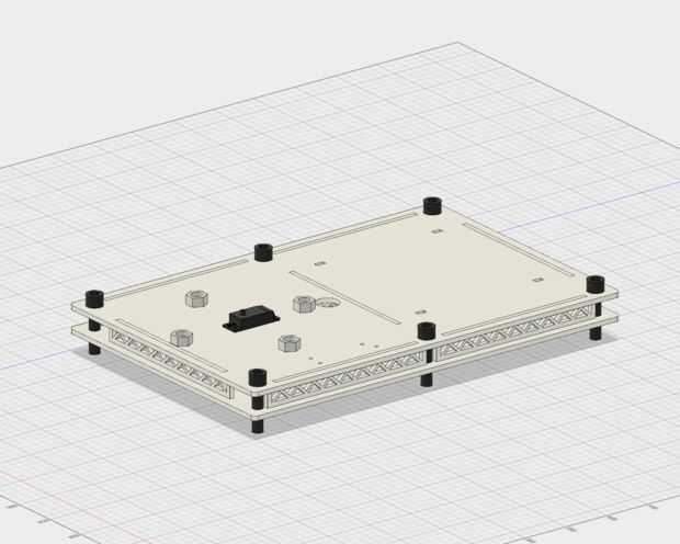 Diseñé la caja caballete para servir varios propósitos. Además sostiene un lienzo en una distancia fija y ángulo del brazo, proporciona un espacio de montaje para ocultar la electrónica. La Junta de controlador Intel Galileo y PWM es atornillada a la placa del lado trasero con tornillo M3 y M2 respectivamente. El avance hacia la placa ofrece un espacio de montaje para la electrónica del interfaz de usuario y la cámara. La cámara está conectada mediante cuatro tornillos de M2 hacia arriba. Los agujeros para los LEDs son inserción ligeramente para que pueden aparecen en el panel con ajuste de fricción. El usuario botón y perilla son de montaje en panel, entonces pop en sus respectivos agujeros y apriete con una tuerca cada uno. El poder de dos interruptores están empotrados y boca abajo para que puedan girarse fácilmente y prevenir cualquier desconexión accidental (que le hará daño el robot). La parte posterior de la base es una puerta con una bisagra hacia arriba.