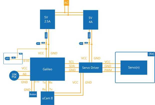 El sistema funciona de dos fuentes de alimentación de 5 voltios: uno de lógica y uno para la alimentación del motor. Desde que Galileo estaría haciendo un montón de procesamiento de precisión, cualquier ruido eléctrico de los motores sería aceptable. La cámara es bastante baja potencia y cada LED tiene resistencia limitadora actual ohmios de 1 K, por lo que la lógica corriente absorbida debe ser fina de la 2,5 unidad suministra ingenio Galileo. Los motores reciben un suministro de 4A 5V carnosos por lo que casi no hay posibilidad de ellos baja en corriente.
