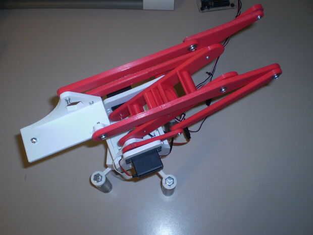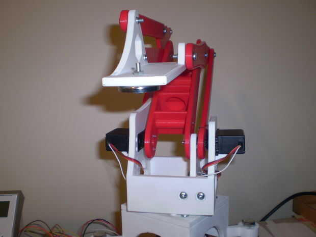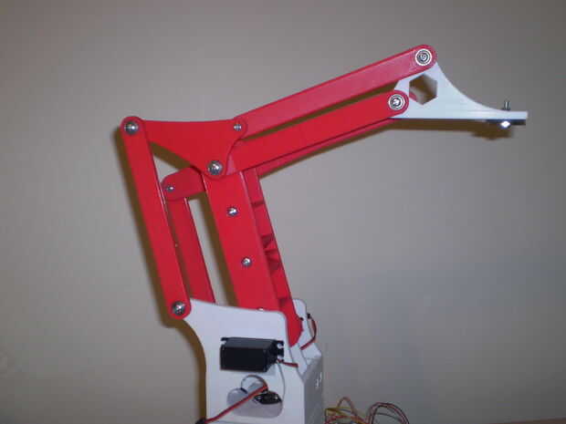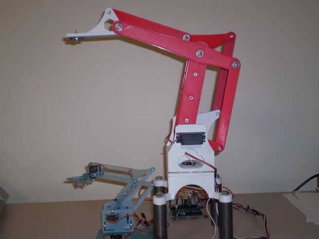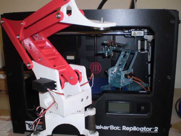 Para ver el original "meArm" Compruebe hacia fuera su proyecto en Pocket-Sized-Robot-Arm-meArm-V04. He comprado su kit de adafruit.com/products/2012 y había divertido poner juntos e intentarlo hacia fuera. Me encanta el diseño parece un brazo robot en una fábrica. El original "meArm" es un buen juego pero un poco débil para cualquier uso real. Encendió el SketchUp y me calentado la impresora 3d. Tiempo para que sea más grande, más fuerte y más largo! Me duplica la escala, añadió rodamientos las articulaciones para el sofoque de movimiento y servos más grandes para ayudar a mover los objetos más pesados. Tuve algunos problemas para superar y tener mas mejoras que me gustaría hacer, pero estoy bien en la forma de un proyecto exitoso.