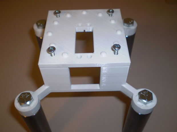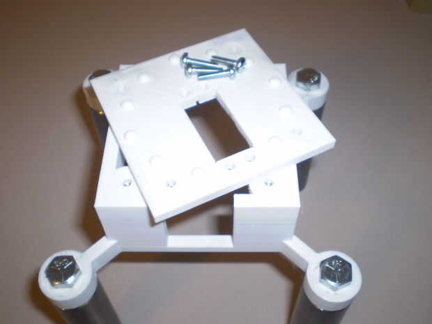 Después de imprimir la piezas requeridas t es hora de empezar la Asamblea. Permite empezar desde abajo para arriba. Inserte las tuercas de la parte inferior del soporte y atornille la tapa con el agujero de servo más cercano a la abertura de servo en el stand. El soporte es donde hice mis primeras mejoras. En el kit de los servos tienen un pequeño tambaleo en la mina de los titulares son agradables y apretado con orificios para hacerlos aún más seguro de montaje. La segunda mejora es las muescas en la tapa. Ayudan a evitar que el brazo de inclinación cuando se levanta algo pesado.