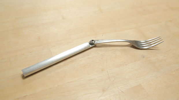 En primer lugar, muele abajo al final de una pieza de 8 pulgadas de barra de aluminio para que tuviera una sección plana para perno de un tenedor. A continuación, taladré un agujero en medio de un mango de tenedor y en el plano de la varilla de aluminio. Finalmente, golpea ligeramente el orificio de la varilla de aluminio y atornillados a la horquilla que con el tornillo cabeza socket tamaño adecuado.