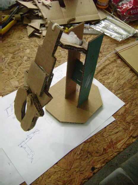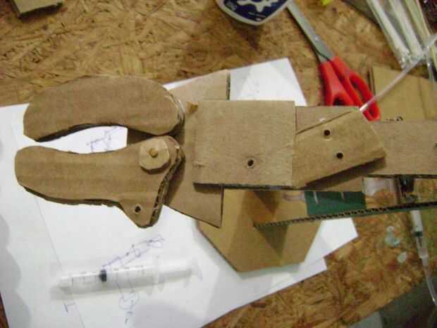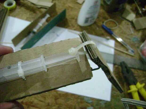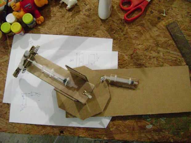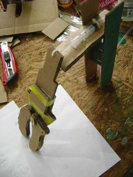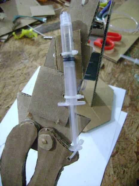 Aftercreatedthearm, clawand basepiecestogetherto testoutthe movimientos derivados si todo estátrabajando bien. Onceassembled, encontramos que el notwell de syringeclampwas colocado. Pedazo de cuta de cardboardto conectar thesyringeto otra posición, como se muestra en la figura.