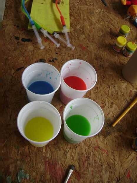 Hemos elegido cuatro colores para colorear el agua y llenar las jeringas. Llene la manguera y luego coloque una jeringa (sin aire en el interior - cierre) en un extremo. Llene otra jeringa (no relleno de todos) y poner el otro extremo. Compruebe el funcionamiento.