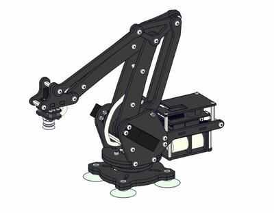El brazo inteligente tiene 4 ejes de libertad gracias al mecanismo paralelo, que era insipred por PalletPack de ABB. MX4 será controlar los movimientos del robot en los 4 ejes con la ayuda de 5 servomotores, 3 servo motores será en la base del brazo que va a controlar la rotación de su eje y el movimiento en el eje X del brazo, y las 2 microServos llevará a cabo en la punta del brazo inteligente para poder coger y girar objetos. MX4 se unirá a una bomba de evacuación y una válvula de solenoide. Estas ayudarán al brazo inteligente para capturar objetos a través de una ventosa sin rayarlos. Va a ser conectado con la ayuda de modo PmodRF2 con guante de conexión Wi-Fi.