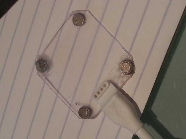 El cargador para el Smartwatch es un poco raro, es sostenido en lugar por el clip posterior que fue quitado en el paso anterior. Es necesario un nuevo método de sostener el cargador en el lugar. Para hacer esto pegué 4 de los imanes de neodimio de 5 x 1 mm y el cargador a una pieza de plástico por lo que cuando el reloj se coloca en el cargador de la atracción magnética entre el plástico y los imanes en la parte posterior del reloj mantenga el cargador firmemente en su lugar.