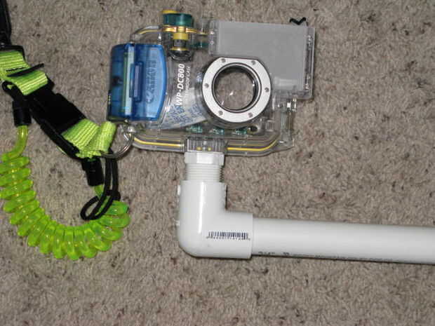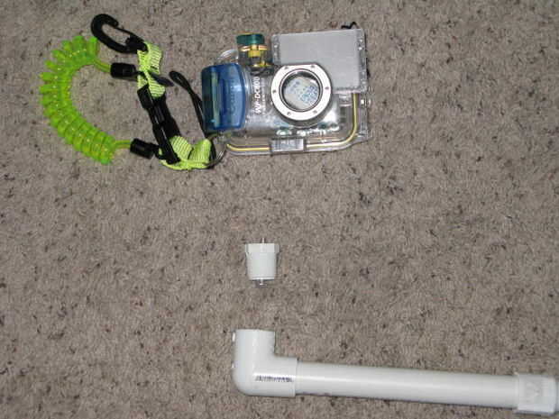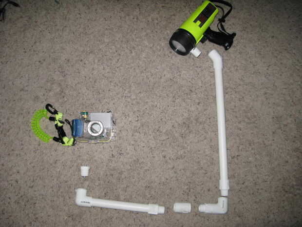 Poner el resto de las piezas como se muestra en la imagen. Sé que este brazo probablemente es manera demasiado grande, pero sólo de cementó un lado de cada uno de los largos de PVC porque necesito hacer unas pruebas con mi luz bajo el agua. Esto significa que puedo separar esas longitudes y recortarlo hacia abajo según sea necesario para mi combo de luz y de cámara.