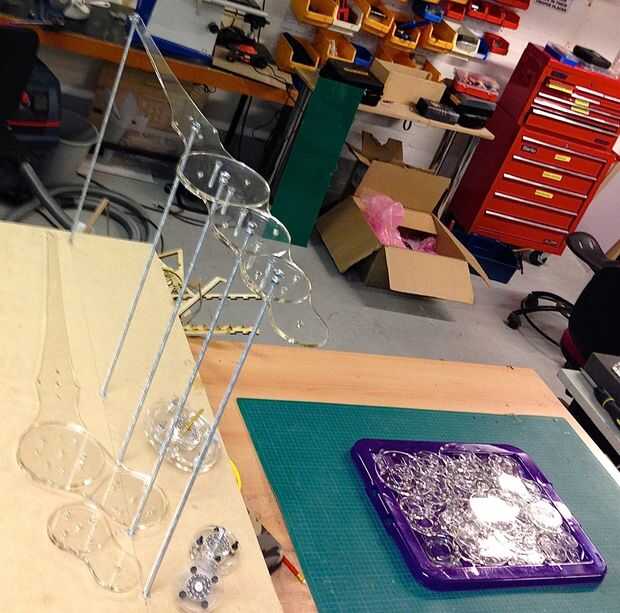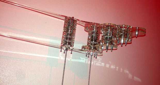 Cuando todos los componentes se atornillan en lugar cortan la rosca de tornillo andamios apoyando los dos brazos juntas (otra vez, utilicé la Dremel PRECAUCIÓN: los pernos roscados calentarán mucho cuando corte, no se queme, y si huele a acrílico empezando a derretir luego pare y deje que se enfríe).