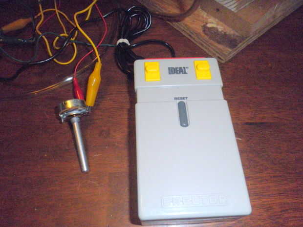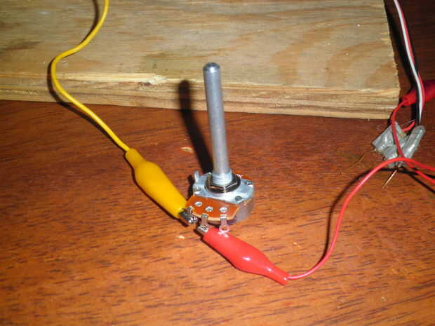 Para el base servo Conecte el cable directamente. Para el brazo horizontal colocar un potenciómetro entre los cables. Esto le ha permitido poner suficiente corriente en el brazo para que se levante sólo lo suficiente como para sostener lo que está recogiendo. Necesita ese tipo de control encontrar o el servo levantará el elemento demasiado rápido. Puede utilizar pinzas para realizar las conexiones. Si desea que el elemento más permanente soldarlos.