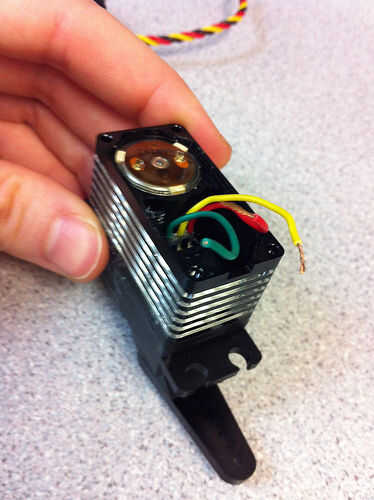 servos de alto torque mentira alrededor de otro proyecto, pero el control tableros habían sido fritos. Puesto que un motor de servo es sólo un motor de corriente continua, algunos engranajes y un potenciómetro integrado, podría utilizar aquellos si fue frito sólo el tablero de control. Por lo tanto, desenroscar la tapa inferior y usa alguna trenza desoldadora para aspirar la soldadura alrededor de los dos bornes del motor.