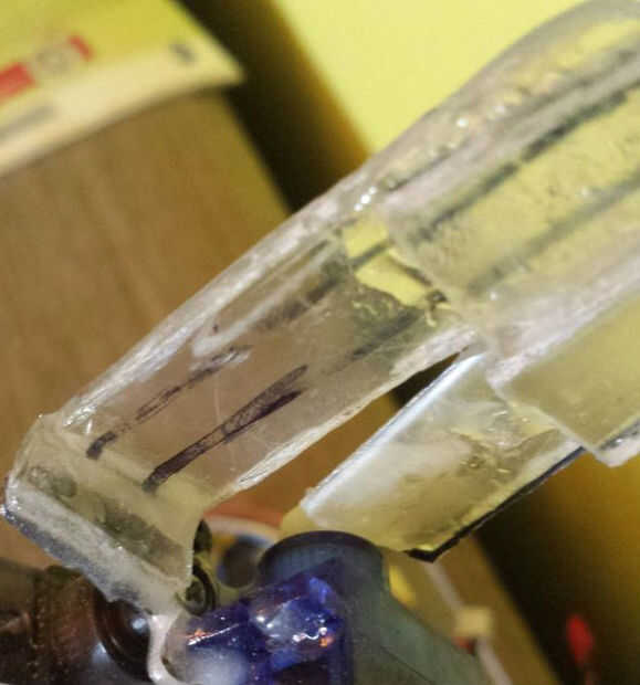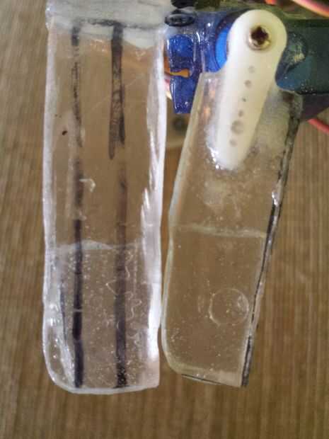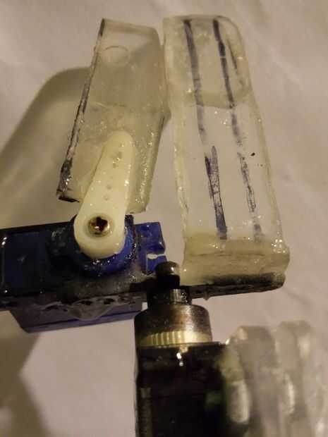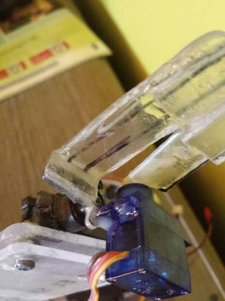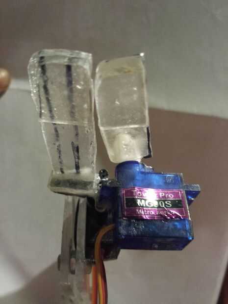primero pegue el servo mg90s al brazo del servo (uno que se coloca en el brazo de movimiento) y poner pegamento allí (primera foto) luego pegar la parte de acrílico de 4x1.5cm para el servo como en la segunda foto.