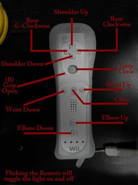 El nunchuk no necesita estar conectado para funcionar todo, solo quería mantener todo flexible. La única diferencia entre usar y no usar el nunchuk son: con el nunchuk conectado sacudiendo el mando a distancia no cambiará la luz encendido y apagado, el joystick añade otra forma de girar el brazo y mover la base, C y Z se utilizan para encender y apagar la luz, inclinar tanto el nunchuk y el wiimote se gire/control de la base.