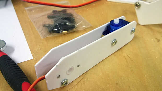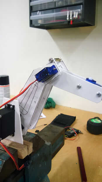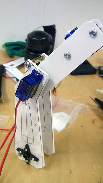 Asamblea fue una tarea bastante fácil. Todo fue planeado por delante así que simplemente Atornillar todas las piezas juntas. Por supuesto hubo algunos ajustes menores que hacer. Os adjunto cuernos servo con tornillos que se incluyó en un paquete de servo. Para la parte inferior del brazo I separó dos piezas con una 12mm y dos separadores de latón de 6mm. Para la parte superior utilicé a sólo un separador de 12mm. Servos son servos estándar hobby. 3 torre pro 9g micro y 1 Torre 996 pro.