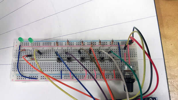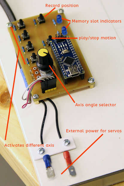 Para controlar el brazo necesita sólo algunos botones y una olla. Primero hice protoboard probar configuración y después de hice muy simple expansión del muelle para arduino nano. Resistencias de telecine par de botones y limitación de corriente para el LED. LED indica cuando se ha salvado pick y lugares de depósito manualmente. Este brazo no está utilizando cualquier material de eeprom por lo que necesitará escribir coordenadas directamente a arduino para uso permanente.