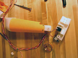 a continuación el antebrazo sustrato (parte 5) de montaje del gancho agarrador y poner el piñón grande (equipo 2) vertical en la ranura en el substrato del montaje que es paralelo y co-lineal alineada con el 0.372? agujero en el substrato de montaje. ¿Inserte el 0.372 a S4 codificador 3? ¿agujero en el sustrato de montaje y el 0.25? agujero en el engranaje grande. Utilice alicates de punta para apretar la tuerca en el codificador