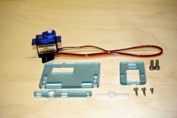 Ahora localizar piezas #4, #5, #6, servo, dos tornillos de 8mm y un servo pack de fijación a la izquierda.