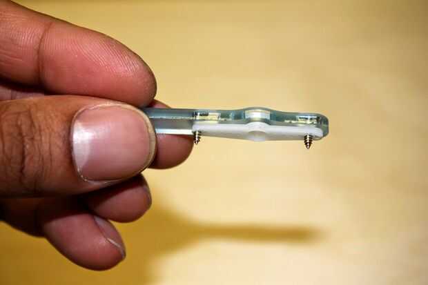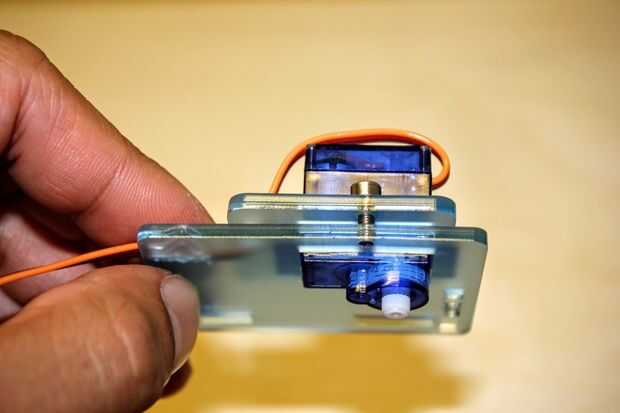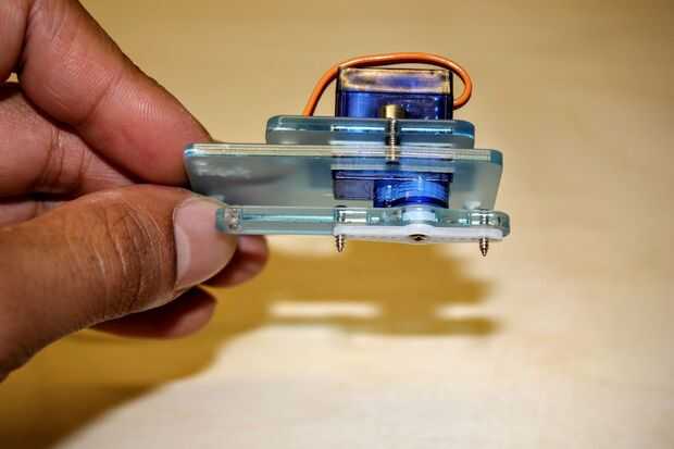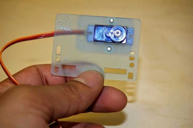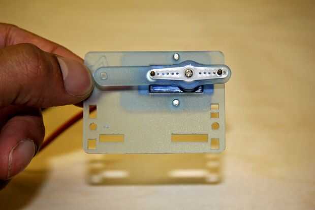 Enrosque el servo por el collar (parte #5) y luego el cable de servo a través del orificio del cable ordenado. El collar a parte #4 usando los tornillos de 8mm teniendo cuidado de no sobre apretarel tornillo. No quiero el acrílico a la curva, sólo mantener el servo en su sitio.