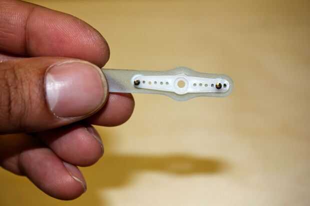 Ahora Conecte el servo de fijación (la cosa blanca, se llaman cuernos) al brazo del servo (#6) utilizando los tornillos afilados del servo pack de fijación. Estos le grifo del uno mismo en el cuerno del servo de plástico blanco. Pueden ser un poco complicado así que por favor tenga cuidado aquí. Si vas a compilar con un niño este es el tiempo que querrá participar.