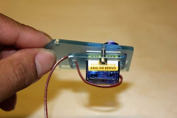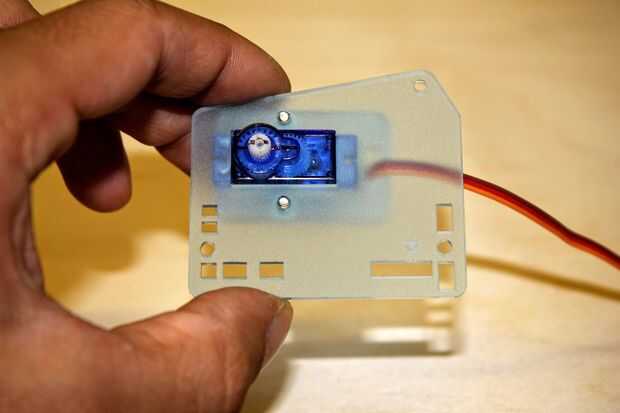 Hilo el servo por el collar y el cable por el pasacables como antes, coloque en la placa lateral con los tornillos de 8mm, otra vez teniendo cuidado de no romper la placa de apriete excesivo.