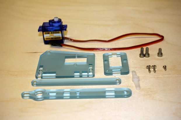 Coloque el cuerno del servo blanco en el brazo del servo (#13) con los tornillos afilados como antes. Coloque esto en el servo con el brazo en 90 grados para el lado más largo de la placa lateral. Otra vez las líneas negras que hiciste deben alinearse.