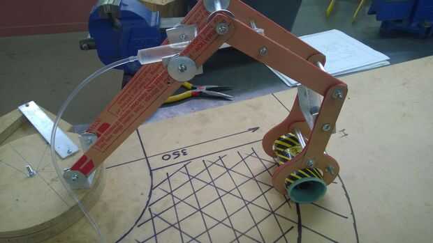 Durante la prueba funcional encontré que mi articulación del codo no se mueve mucho lo suficiente para que tras un debate con el Sr. Richardson y ensayo y error, moviendo el pivote de la jeringa hacia arriba y hacia abajo me mudé el orificio de la jeringa pivote más cerca del punto de pivote para dar más movimiento que ahora se mueve una distancia adecuada, pero aún conserva suficiente palanca para levantar el brazo, pero ahora no podía llevar el brazo atrás lo suficiente porque fue detenido por la jeringa de modo que pregunté Señor Richardson si podía mover todo mi base hacia atrás un poco para que venga detrás lo suficientemente lejos y todavía llegar lo suficientemente lejos y me dijo que sí y se muestra en esta foto todavía alcanza el límite mínimo que tiene que llegar y recoger el contenedor.
