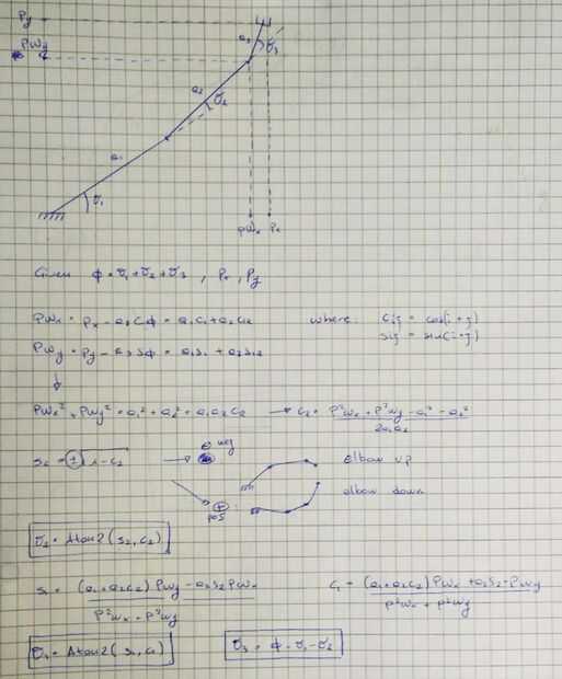 He subido un documento escrito a mano con las ecuaciones, y actualmente estoy trabajando para un nuevo código para usarlos. No debería ser demasiado difícil, básicamente tiene que leer los joysticks, utilizar sus lecturas para modificar las coordenadas xyz de la empuñadura y luego darles a mis ecuaciones, calcular los ángulos de servos y escribirlas.
