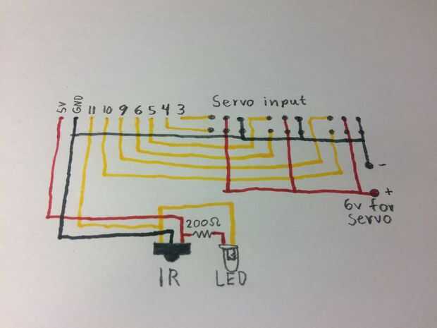 Aquí es fácil seguir el esquema que yo he dibujado. Rojo es 5v a la IR y 6v para los servos, negro es GND y el amarillo es la señal.