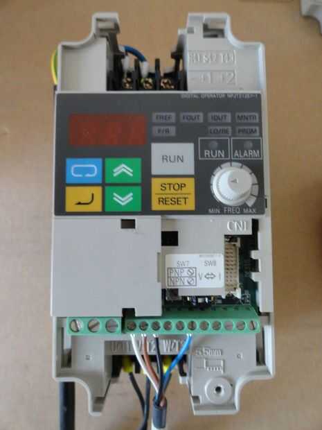 Los variadores de frecuencia son necesarios para poder controlar la velocidad del motor. El motor originalmente funciona en 50Hz, pero fue demasiado rápido para este procedimiento. Luego puse la frecuencia de 33Hz como una base de ajuste. A través de su velocidad cambiar el selector de entrada, también existe la posibilidad de cambiar la velocidad desde el código de programación del robot. El variador viene también de segunda mano, pero hace su trabajo muy bueno. También es necesario un interruptor de emergencia (un gran botón rojo) para conectar por razones de seguridad.