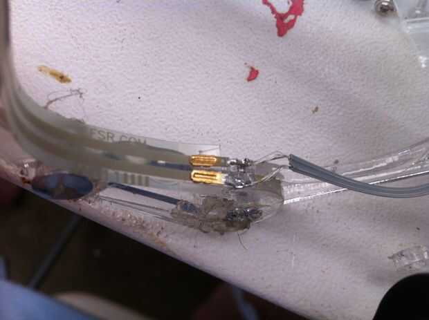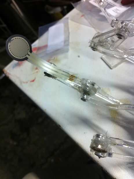Pegar el revés de los sensores de presión a las puntas de los dedos, luego soldar los cables extendidos a sus conductores. (esto es para la regeneración. IMG [7-11]